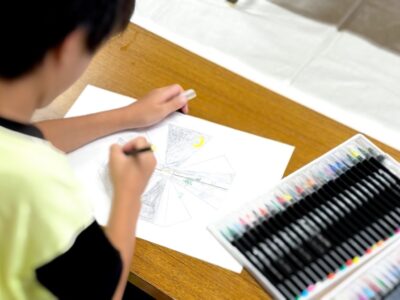 小学生のお子さんと親子で参加。目がバグる!見る角度でだまされる不思議な絵を作るワークショップ。